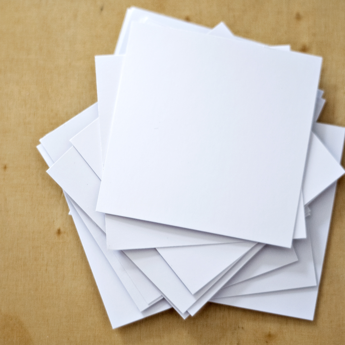 Zu kaufen gibts Brettchen vor allem aus Holz – zum Selbermachen eignet sich allerdings besser eine Version aus Pappe oder Papier. Dabei sollte das Papier recht stabil und möglichst ein wenig beschichtet sein. Klassischerweise werden Kartenspiele oder Memory-Spiele dafür benutzt. Ich habe einen Satz von meinen Promo-Postkarten genommen, die ich mal hab drucken lassen und die es nur im 1000er Pack gab. Von denen hab ich also noch eine Menge übrig.