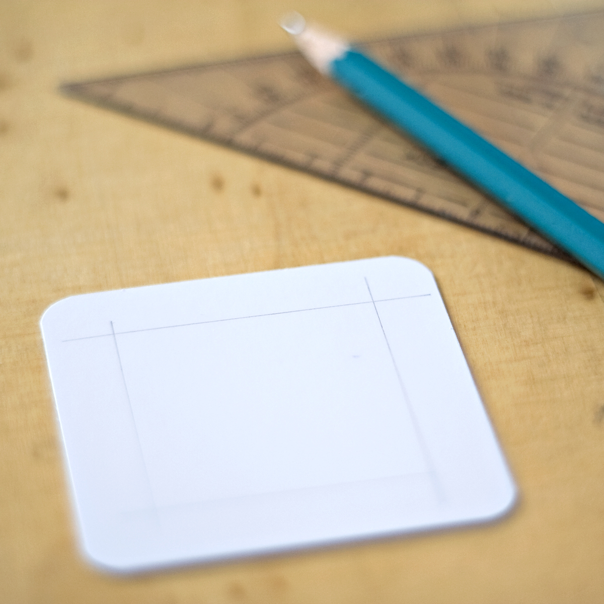 Im nächsten Schritt müssen wir die Löcher in die Kärtchen stanzen. Also hab ich mir als erstes ein Kärtchen als „Schablone“ vorbereitet: Dafür habe ich mit dem Geodreieck jeweils 1cm vom Rand aus Linien gezogen. Dort, wo sie sich berühren, wird dann jeweils ein Loch gesetzt. Je präsizer dabei die Löcher in den Kärtchen sitzen, desto besser.