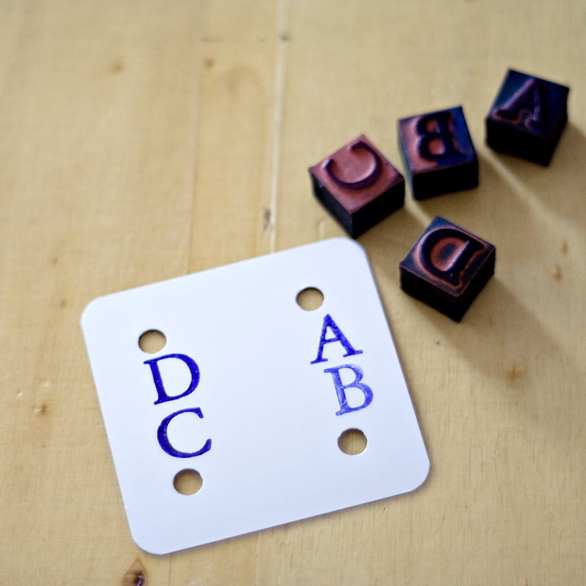 Jetzt fehlen eigentlich nur noch die Markierungen – nicht alle halten die für notwendig, aber ich fand sie äußerst hilfreich. Gerade Anfänger können so gut den Überblick behalten, in welcher Position sich die Brettchen später beim Weben befinden müssen. Wer mag, kann die einfach mit einem wasserfesten Stift auf die Kärtchen schreiben. Ich fands schöner, die zu stempeln. Die Anordnung der Buchstaben ist die, die üblich ist – also am besten nicht verändern, da viele im Internet oder in Büchern auffindbare Muster sich an dieser Anordnung orientieren und man sonst ordentlich in den Tüddel kommen kann.