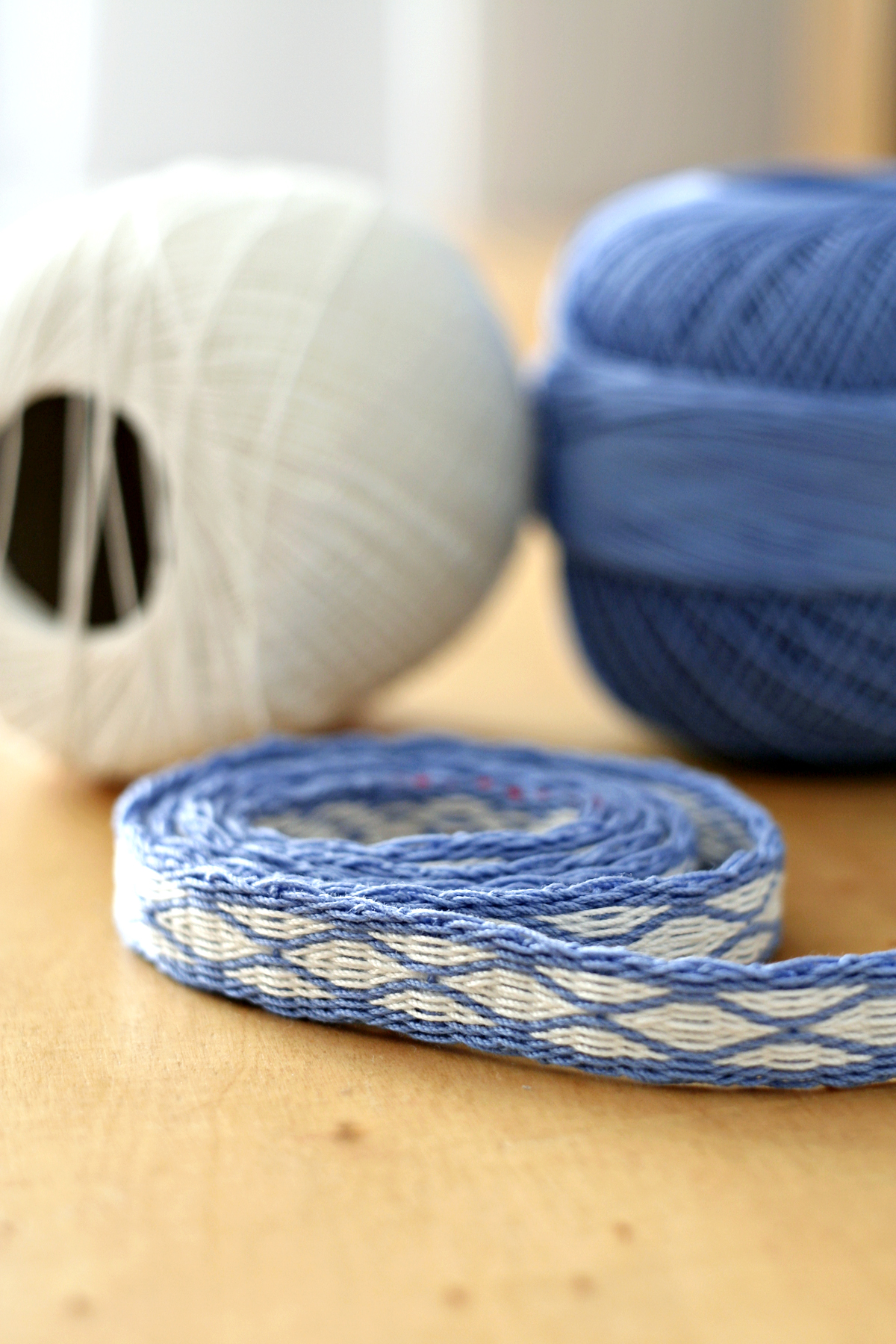 Als ich in einer kleinen Sonderausstellung gesehen hatte, dass Karin Larsson (Frau des berühmten schwedischen Malers Carl Larsson) ihre Bordüren mit eigenen Entwürfen selbst gewebt hat, musste ich sofort nachschauen, wie so etwas geht. Gut, Frau Larsson hatte einen ausgewachsenen Webstuhl in ihrem Wohnzimmer stehen und ich hab nur einen kaputten Schulwebrahmen aus den 80ern. Die Lösung lautet daher: Brettchenweben.