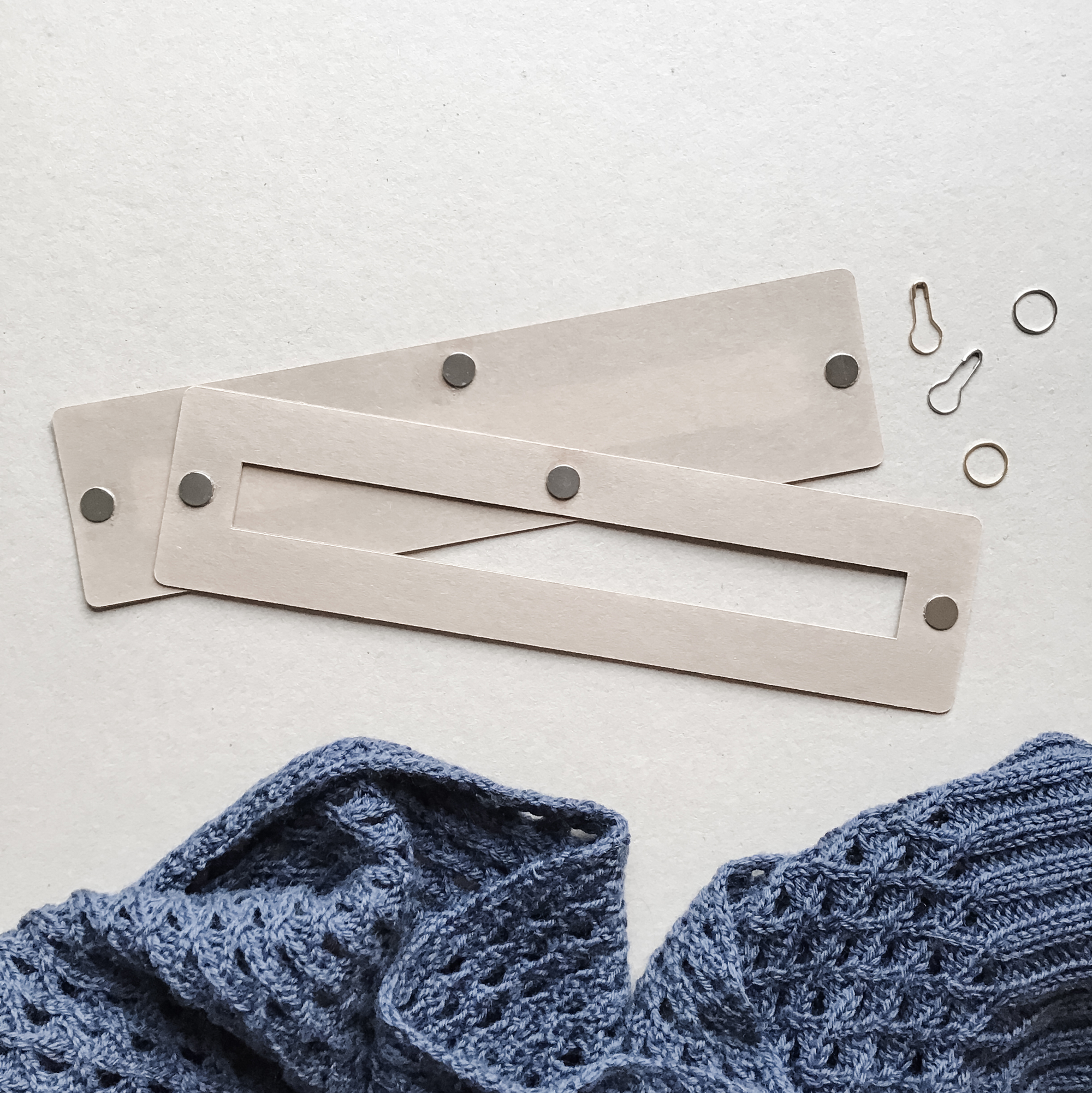 Und weil ich mir auch beim Stricken nix merken kann, habe ich mir ein wunderbares kleines Werkzeug für Strickschriften selbst gebastelt: Ein sogenanntes Stricklineal. Das wird durch Magnete an der Anleitung befestigt und man verliert nie den Überblick, was man gerade strickt. Das ist insbesondere auch dann super, wenn man Projekte mal ein paar Tage oder Wochen liegenlässt. Mit dem Stricklineal weißt du immer, wo du wieder ansetzen kannst.