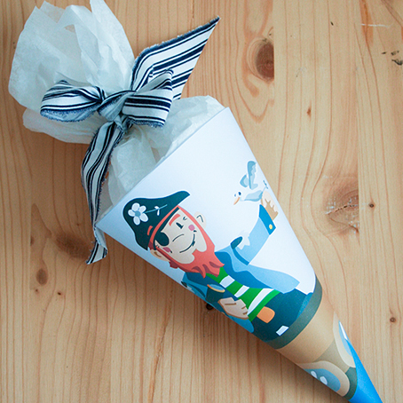 Für den ersten Kindergartentag oder für die kleinen Geschwisterchen, die bei der Einschulung von den Großen nicht heulend ohne etwas daneben stehen sollen: Mini Piraten-Schultüte zum Selber-Ausdrucken und zusammenkleben.