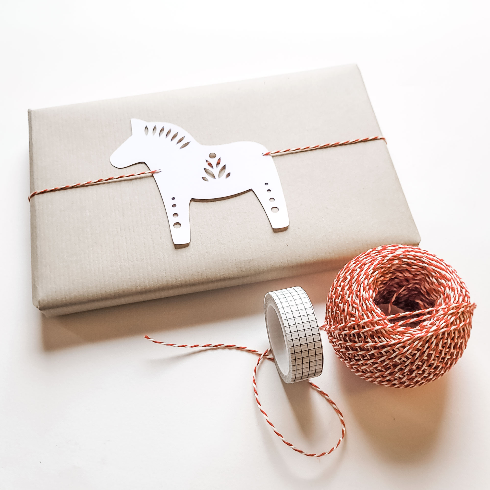 Jedes Dalapferd eignet sich übrigens auch ganz super als Geschenkverpackung, wie du auf dem letzten Foto sehen kannst. Einfach das Pferd mit dem Geschenkbank an den Päckchen befestigen, eventuell noch den Namen des/ der Beschenkten auf das Pferd schreiben und schon hast du ein superhübsches und umweltfreundliches Geschenk.