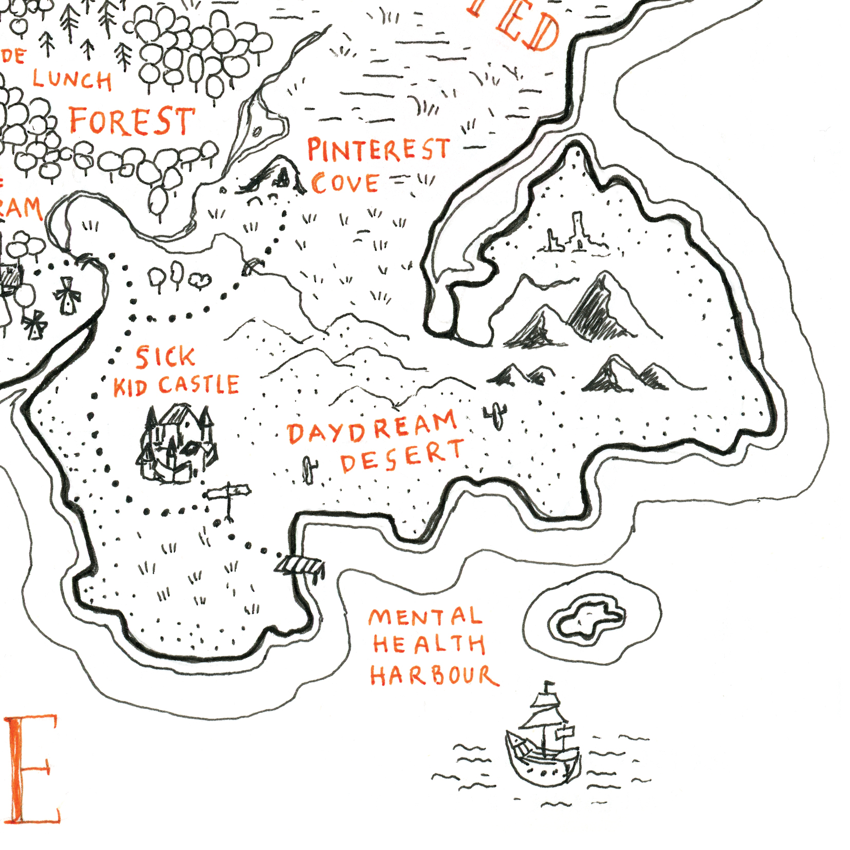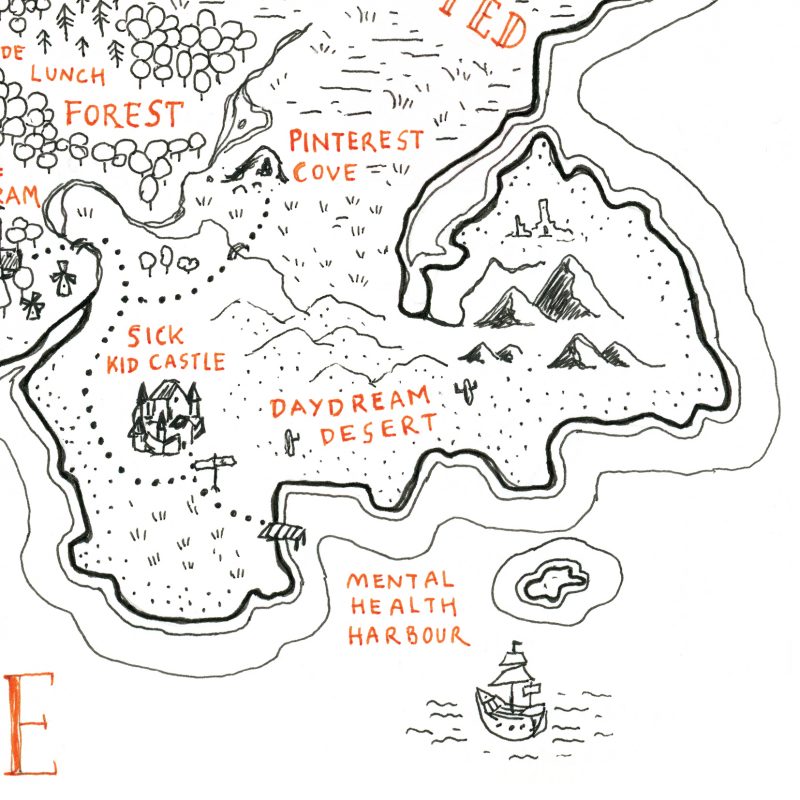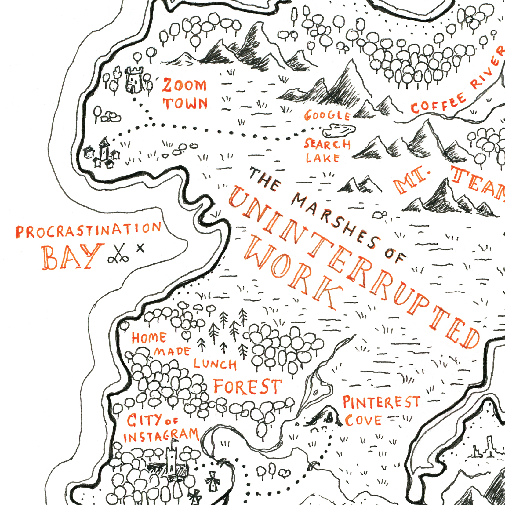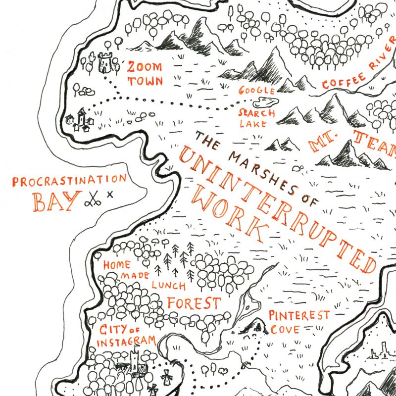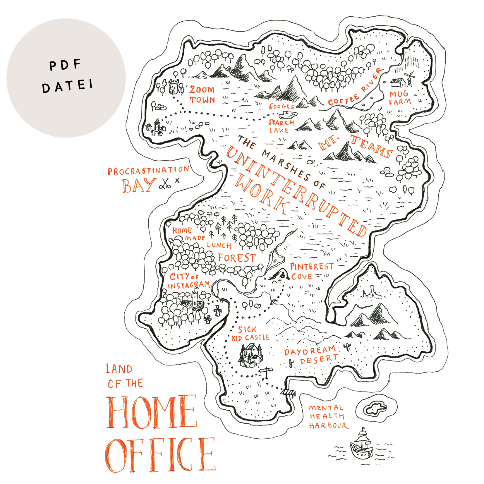 Hier ist also die „Home Office“ Karte mit allem, was die Arbeit Zuhause ausmacht: Von der ungestörten Arbeitszeit über Prokrastinations-Kämpfe und Kaffee-Flüsse (plus Platz für den Lieblingsbecher) ist alles dabei. Denn die Arbeit im Home Office hat zwar unschlagbare Vorteile, aber eben auch so spezielle Eigenheiten. Zum Beispiel, dass man sehr viel leichter in Instagram City oder der Daydream Desert versackt. :)
