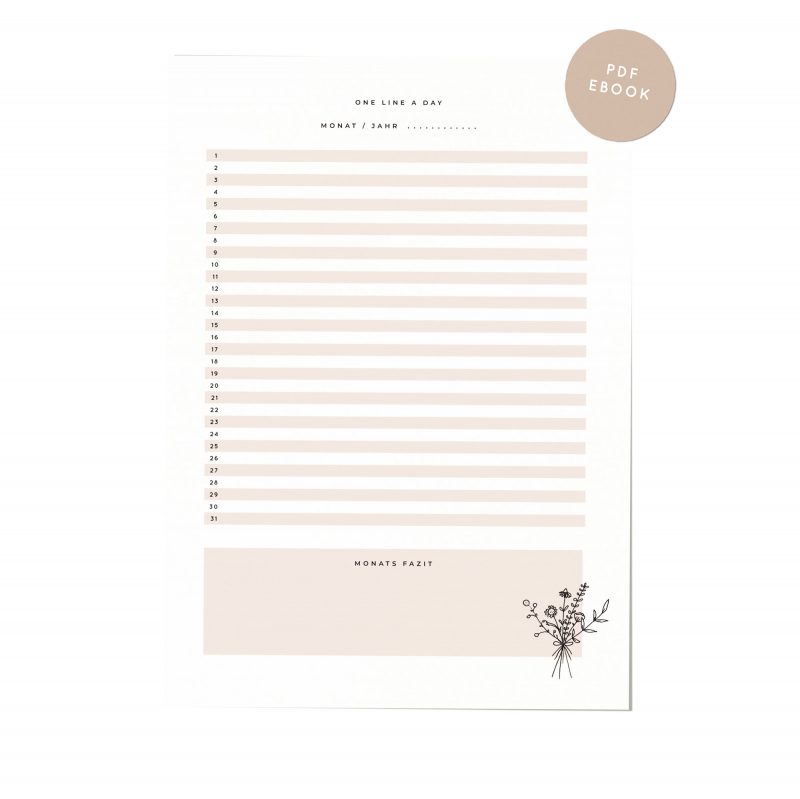 Das pdf besteht aus einem One Line a Day Template in A4 mit einer kleinen Blümchenskizze, einer Vorlage mit Wochenfazit (auch mit Skizze), einer blanko Version für deine eigenen Zeichnungen und einer zweiseitigen A5 Version. So kannst du jeden Monat entscheiden, welche Variante dir am liebsten und für dich am passendsten ist.