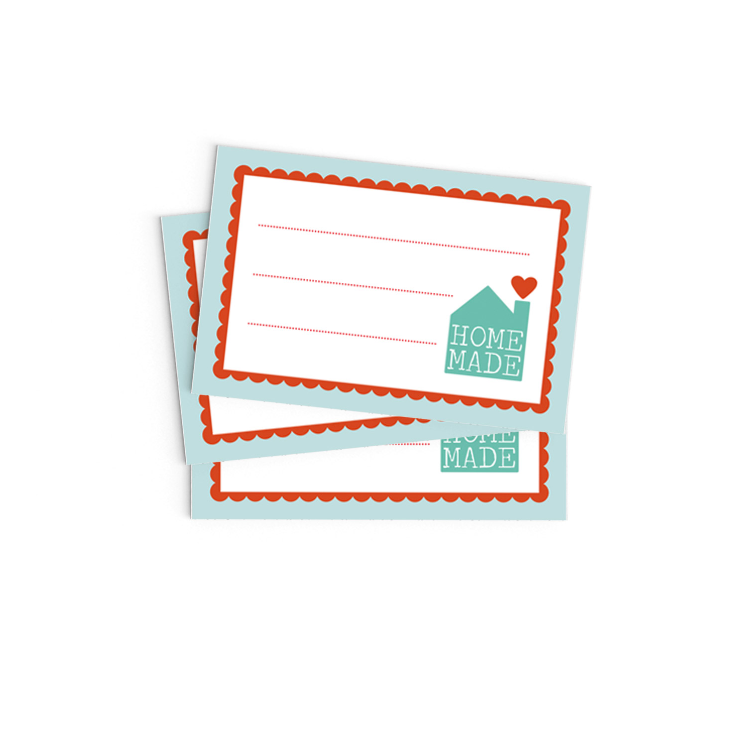 Die zehn Etiketten sind 8.5 x 5.5. cm groß, selbstklebend, haben eine matte (und damit wunderbar beschreibbare) Oberfläche und eine Rückseite, von der man durch eingearbeitete Schlitze die Trägerfolie ganz leicht abziehen kann. Der Druck ist ein professioneller Offsetdruck, so dass die Farbe zwar nicht komplett wasserfest, aber relativ unempfindlich ist.