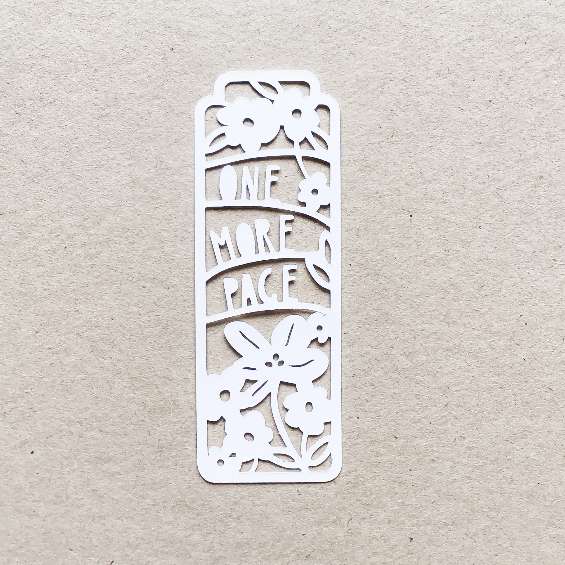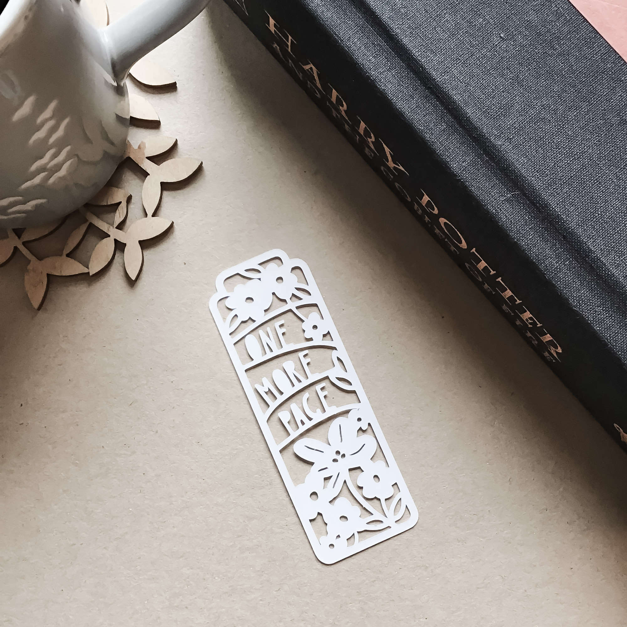 Schön-schlichtes Lesezeichen (ca. 3.5 x 9.8 cm) mit „One More Page“ Scherenschnitt Motiv.