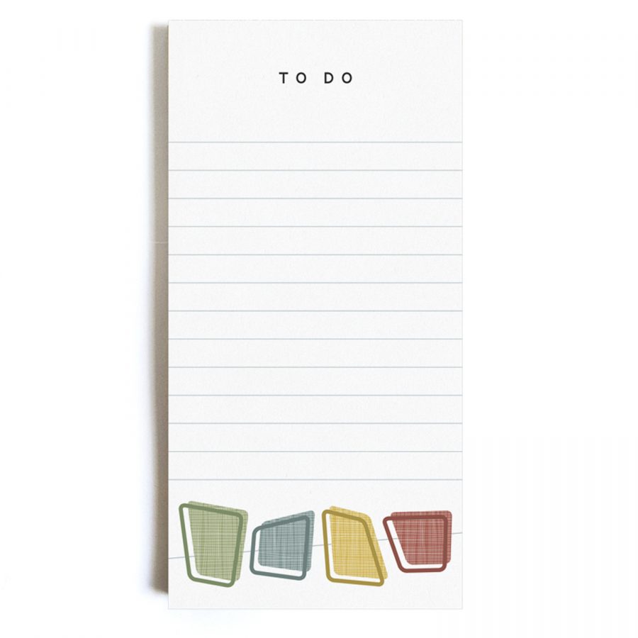 Wunderhübscher Notizblock mit leicht texturierten 50er Jahre Rechtecken im Format DIN A lang (also 10.5 x 21cm). Mit 50 bedruckten und am Kopf geleimten Seiten. Perfekt für alle, die ihre To Do Listen noch gern mit Stift auf Papier schreiben.