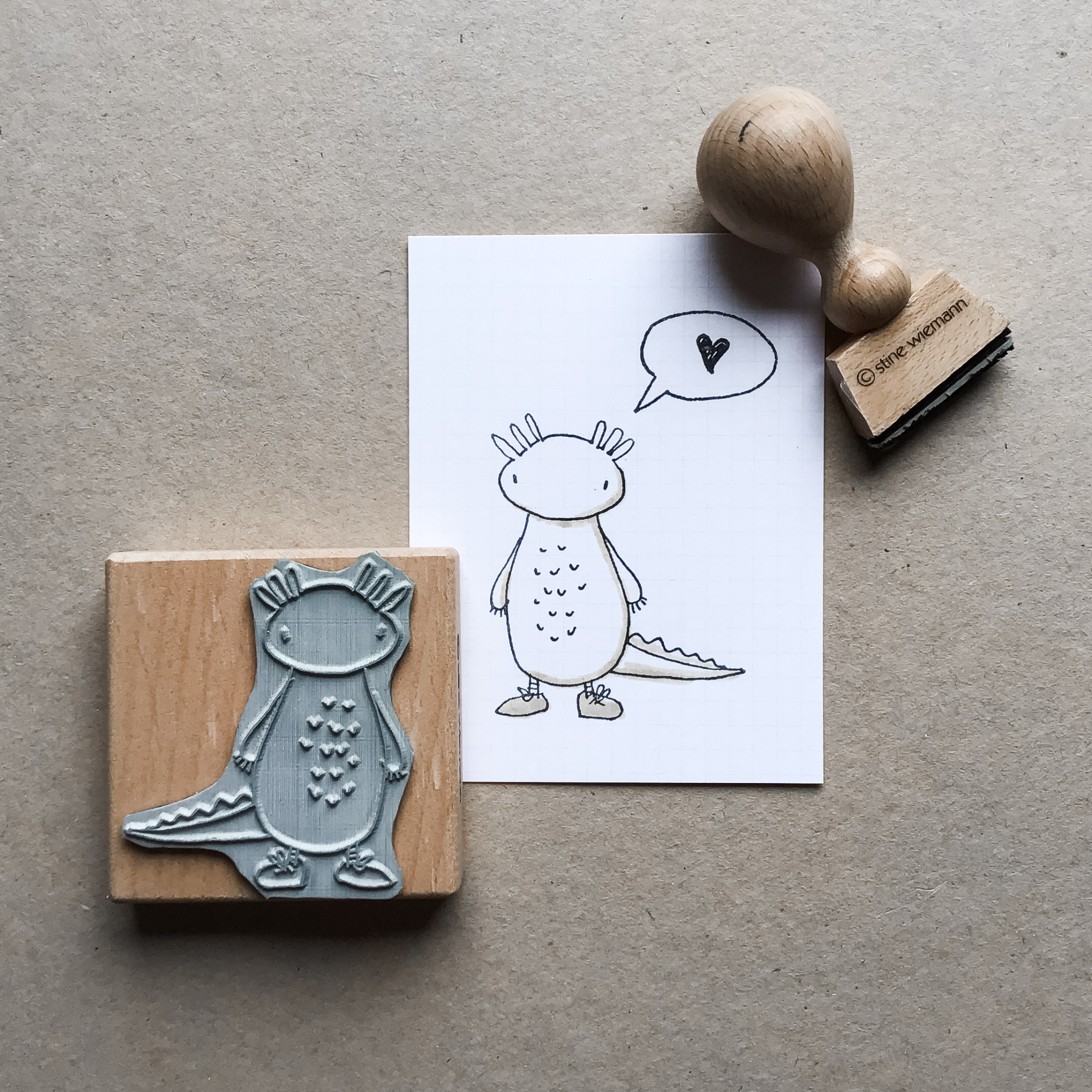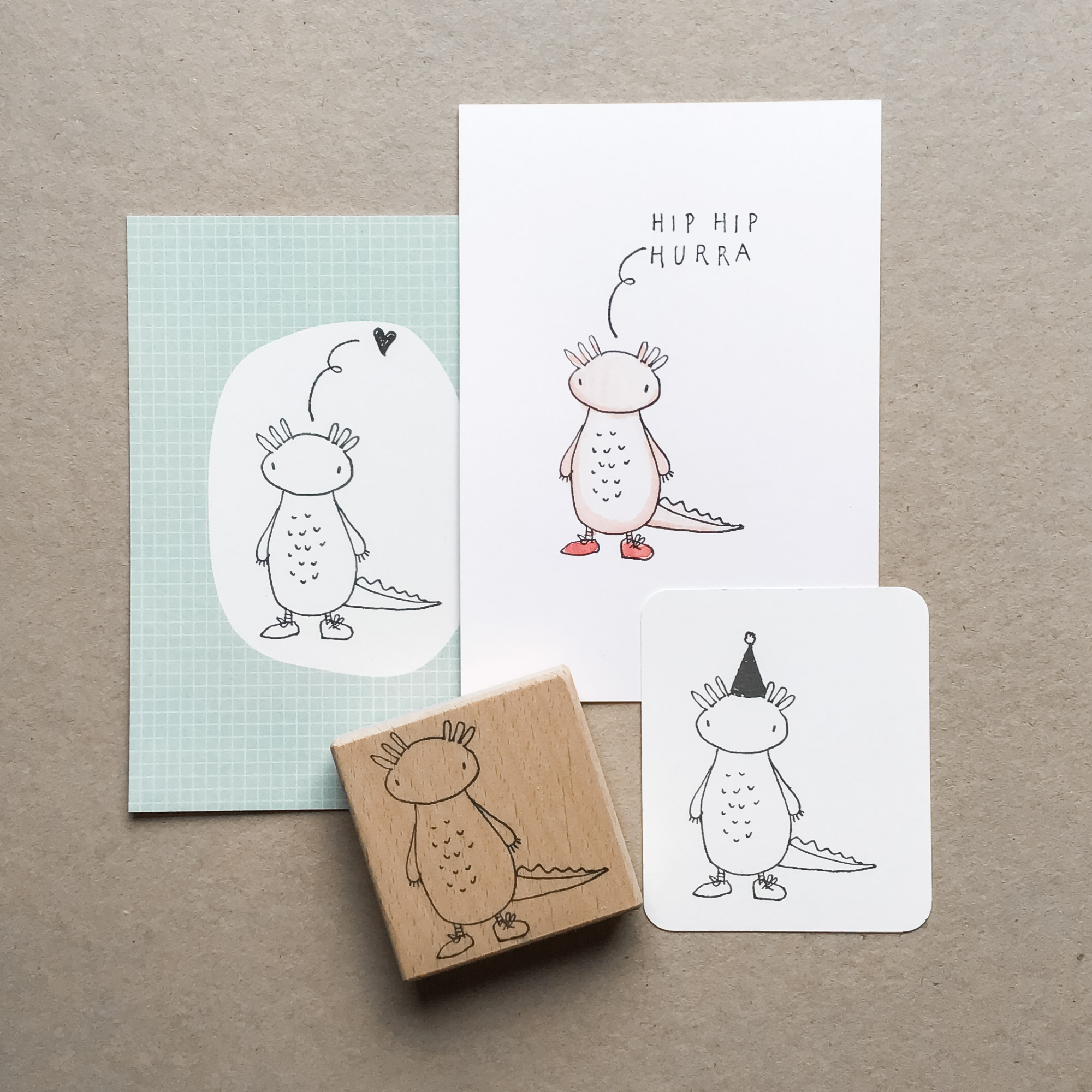 Das Motiv lässt sich ganz schlicht in schwarz-weiss bzw. einfarbig stempeln. Du kannst es aber auch als „Malvorlage“ stempeln (am besten mit einem wasserfesten Stempelkissen) und dann nach Herzenslust ausmalen. Mit meinem kleinen „Sprech-Schlenker“ oder der Sprechblase und Textstempeln aus meinem Sortiment (oder deiner Sammlung) kann Axl übrigens auch sprechen „lernen“ – ein paar Beispiele siehst du in den Produktfotos.