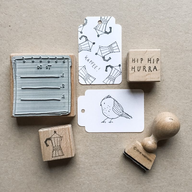 Das Stempelgummi ist in Deutschland gelasert und dann liebevoll per Hand montiert. Dadurch kann es zu kleinen Unterschieden zwischen der Positionierung auf dem Stempel und der Abbildung auf dem Holz kommen. Durch das relativ passgenaue Stempelholz lässt sich aber der Abdruck recht gut abschätzen.
