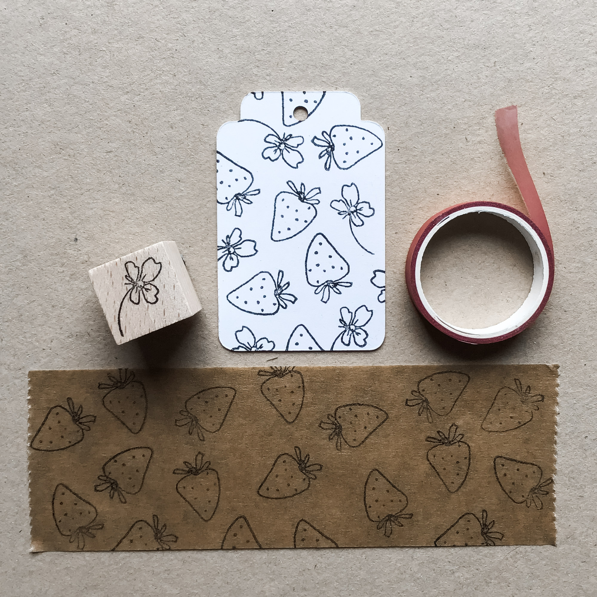 Meine liebste Jahreszeit? Frühling! Und am allerbesten: Spragel- und Erdbeerzeit. Passend zur kleinen Erdbeere gibt es auch noch diese hübsche Erdbeerblüte. Mit diesem Stempel lassen sich nicht nur schöne Muster auf Geschenkanhänger, Karten oder Briefpapier stempeln, sondern auch Geschenkpapier und vieles mehr.