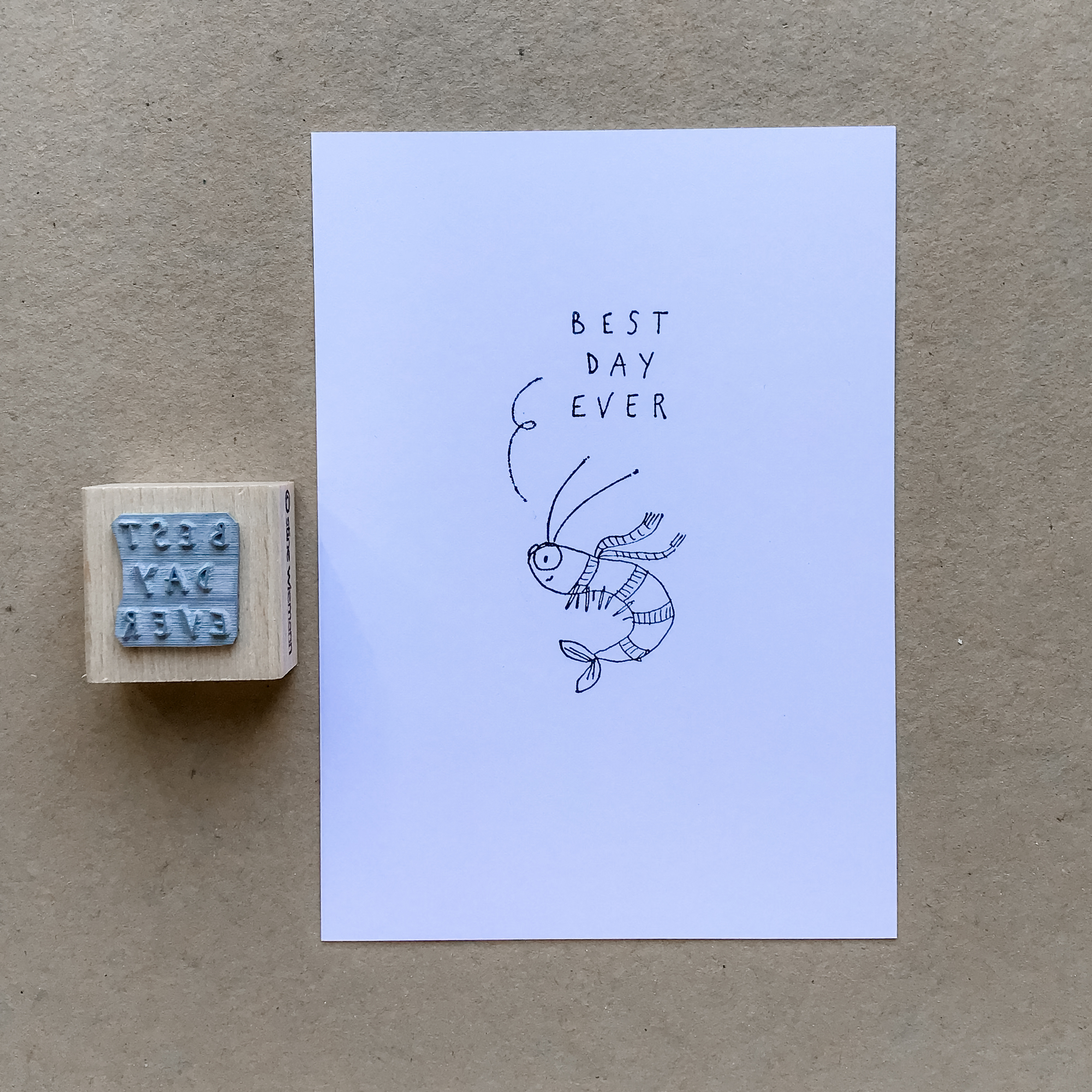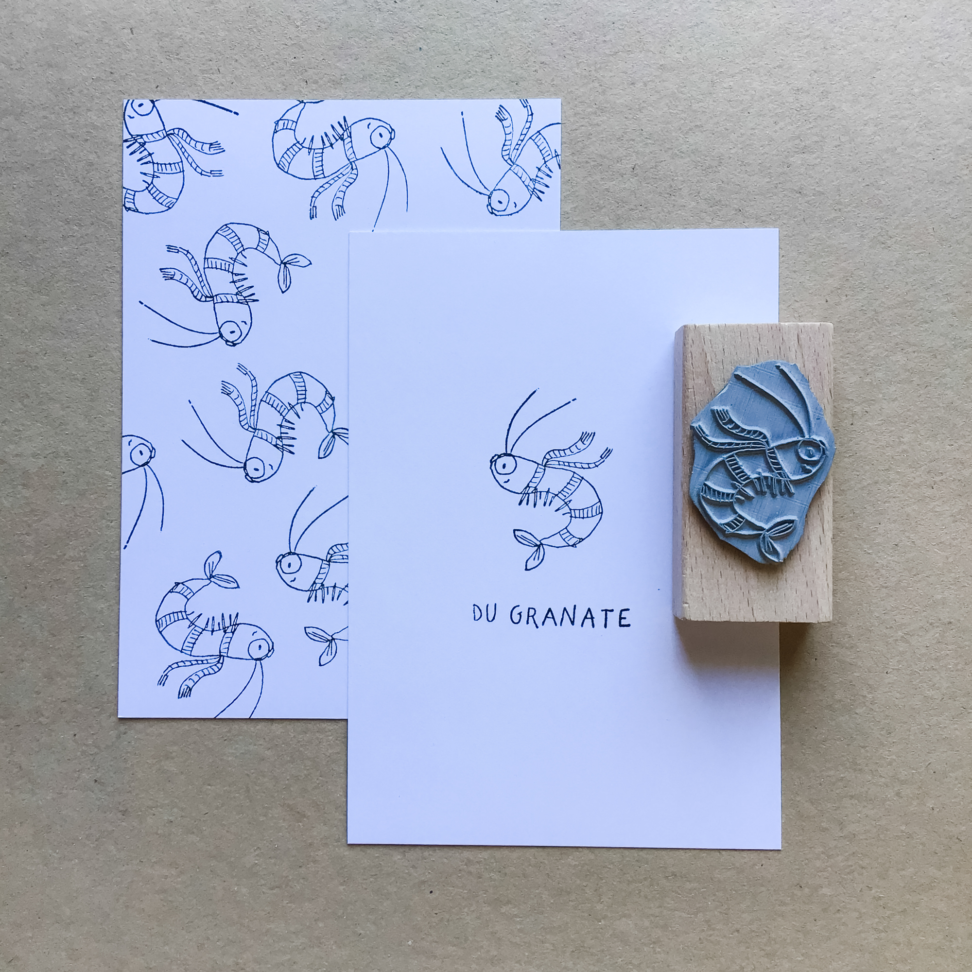 Das Motiv lässt sich ganz schlicht in schwarz-weiss bzw. einfarbig stempeln, ist aber (mit der geeigneten Stempelfarbe) auch ganz wunderbar als Basis für eine kleine Wasserfarben- oder Buntstift-Skizze. Wenn du die kleine Krabbe etwas „sagen“ lassen möchtest, eignen sich dafür mein „Sprechschlenker“-Stempel oder die Sprechblase total gut. Dazu gibt es bei mir im Shop auch passende Texte oder Symbole, die den Krill-Stempel ganz wunderbar ergänzt. Zum Beispiel der „Du Granate“-Stempel, weil ja Krabben im Norden häufig auch „Granat“ genannt werden. Du kannst den Stempel aber natürlich auch prima mit anderen Motiven aus deiner Sammlung kombinieren.