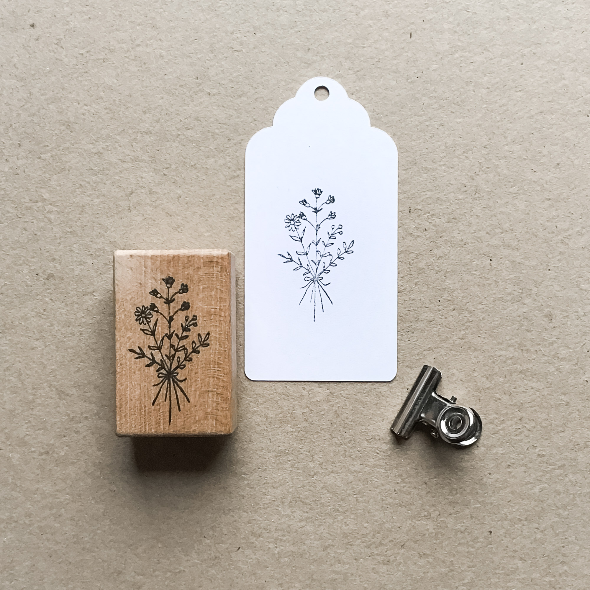 Das 27x31mm große Stempelgummi ist auf einem griffigen Buchenholz-Block montiert. Zwischen Stempelgummi und Holz befindet sich eine federne Moosgummischicht. Dadurch lässt sich der Stempel besser drucken. Der Blumenstrauss ist zur besseren Orientierung noch einmal aufgestempelt.