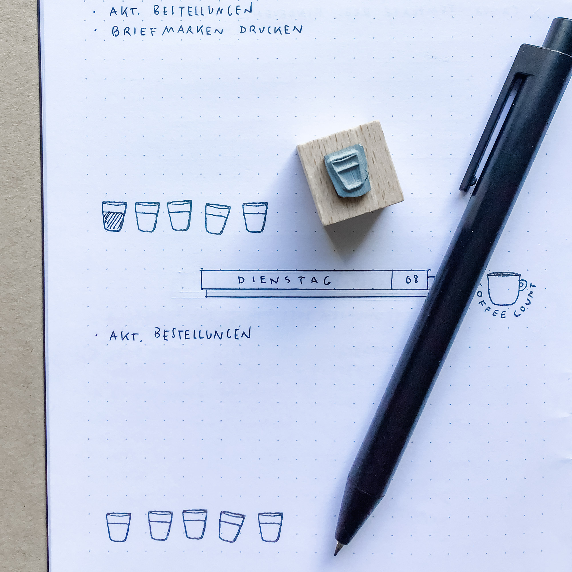 Okay, mal ehrlich: Wer vergisst auch immer ausreichend zu trinken? Ich muss mir tatsächlich notieren, wieviele Gläser ich schon intus habe, damit ich hier nicht am Ende des Tages zu einem Häufchen Staub zerfalle. In meinem Tagesplaner habe ich daher nicht nur einen „Coffee Count“, sondern auch fünf kleine Wasserglas-Skizzen, die ich jeweils anmale, wenn ich mal wieder ein Glas leergetrunken habe. Wie das aussieht, habe ich dir mal „am lebenden Objekt“ (aka mein Bullet Journal) abfotografiert. Mein Planer ist zwar nicht sonderlich hübsch, aber superpraktisch.