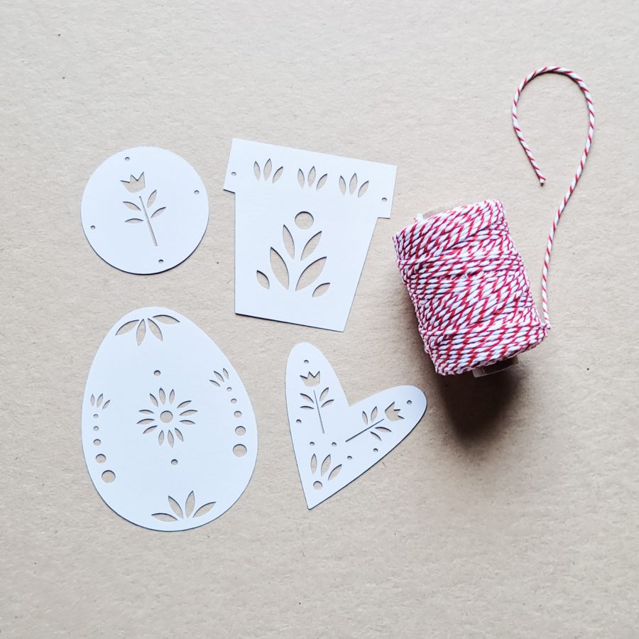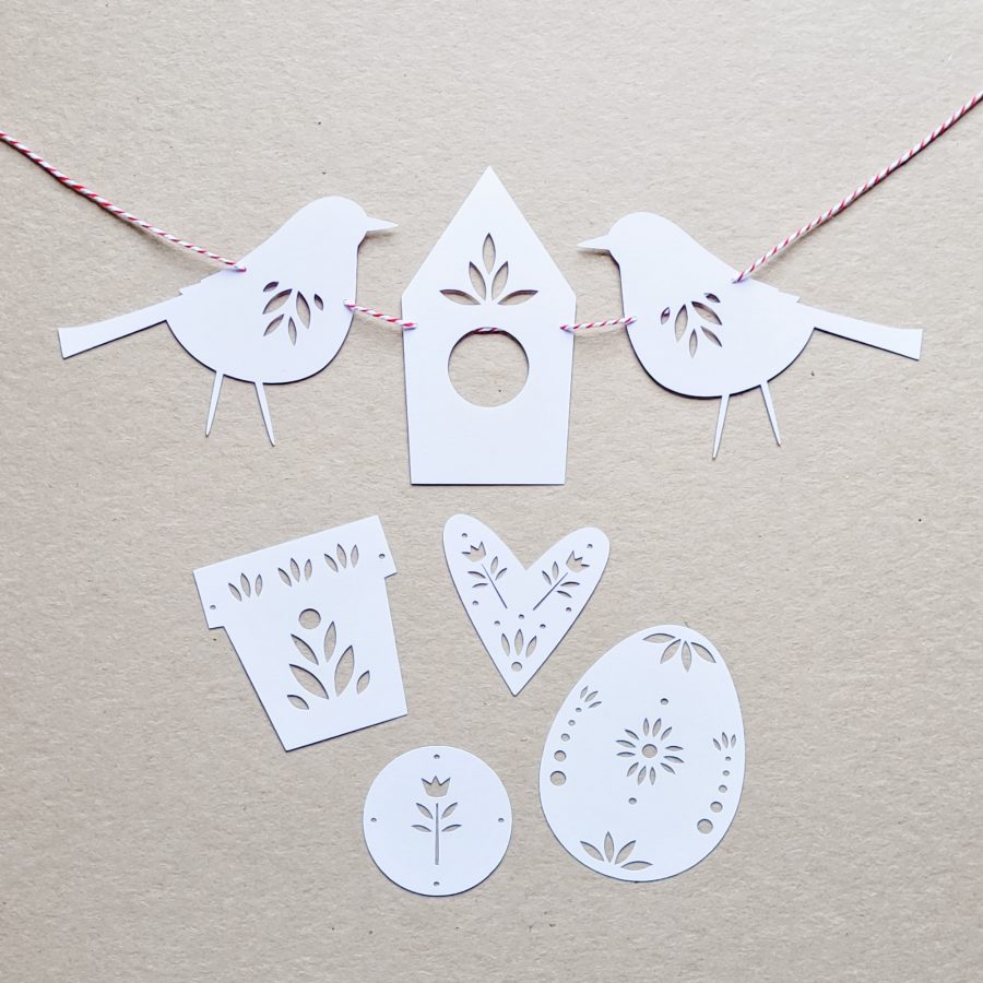 Ich habe für meine Girlande ein ganz schlichtes weißes Papier genommen (das hat 250 gr/qm) und das Material in meinem Cricut Plotter auf den Karton mit Präzisionsschnitt gestellt. So wird das Motiv zwar etwas langsamer geschnitten, aber auch kleine Details kommen so gut zur Geltung und werden ganz sauber geplottet.