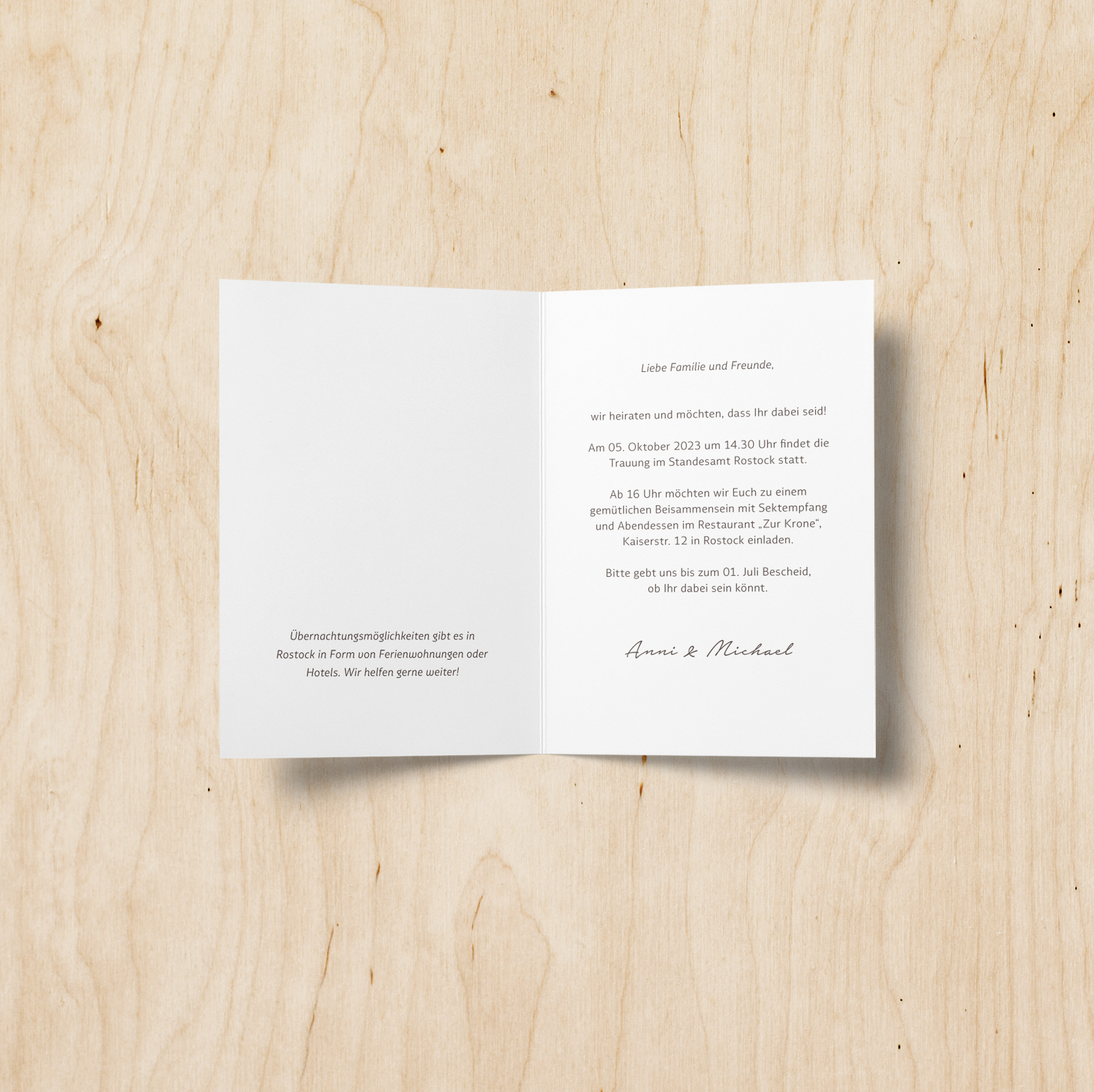 Eine andere Möglichkeit ist, in die Einladung noch ein kleines Zusatzblatt einzulegen. Damit habt ihr dann innen 6 Seiten für euren Text und das reicht für die meisten Fälle ganz prima aus. Auch dafür könnt ihr mich sehr gern kontaktieren und dann besprechen wir die Details.